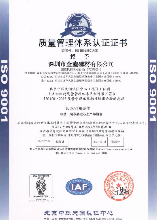 熱烈祝賀金鑫磁材通過國家ISO9001:2008質(zhì)量管理體系認證